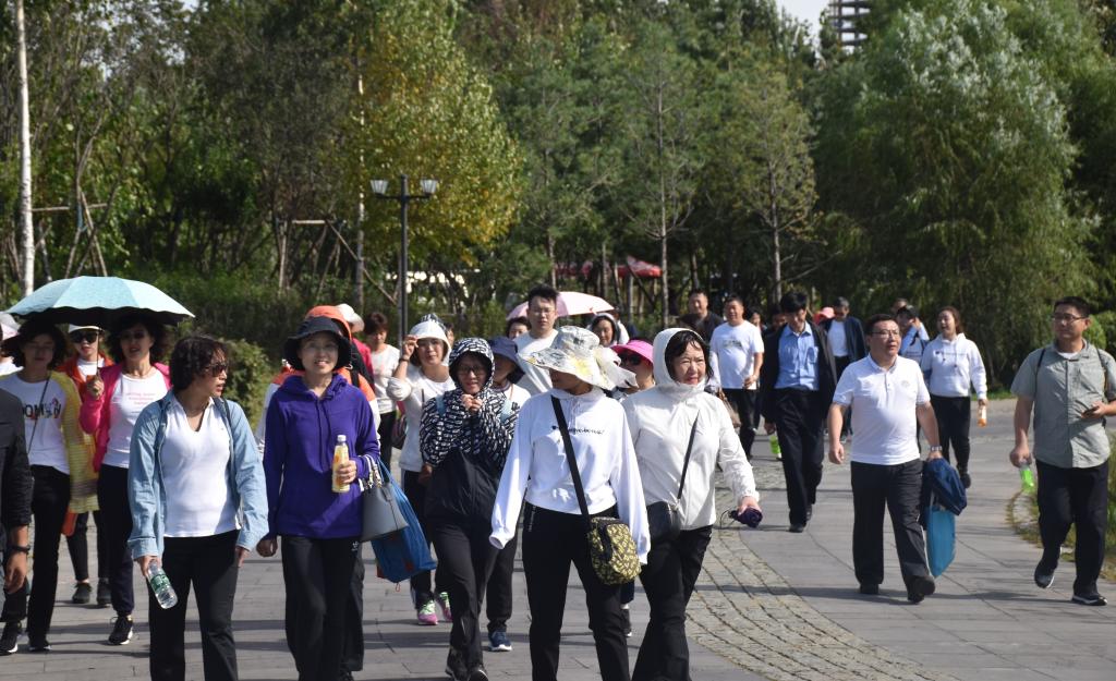 拔河和跳绳两项激烈的比赛结束之后,徒步运动正式开始,全体教职工参加了此次徒步运动。北湖湿地公园美景如画,秋日高远的天空,万里无云,没有了夏日的燥热,处处洋溢着秋色的绚丽。在徒步过程中,大家一路欢声笑语,欣赏北湖美景,尽情享受徒步运动的快乐。
