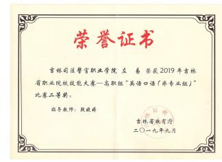 2019年度吉林省职业院校技能大赛-高职组英语口语大赛落下帷幕,我院派出由基础部外语教研室段晓婷老师担任指导教师的J18307区队左易同学在非专业组比赛中荣获二等奖;由基础部外语教研室郝爽老师担任指导教师的J18301区队李慧斌同学在专业组比赛中荣获三等奖,段晓婷老师,郝爽老师分别荣获指导教师二等奖和三等奖。