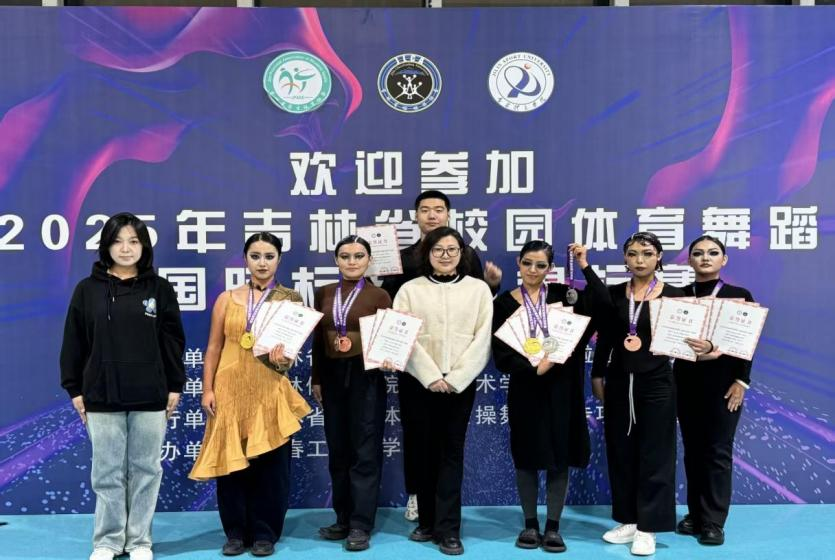 在吉林省校园体育舞蹈(国际标准舞)锦标赛的赛场,由李光辉、高闻璐、信玲玲三位教师指导的体育舞蹈舞代表队,以优雅的舞姿、精湛的技艺和默契的配合,勇夺“三金、两银、三铜”的丰硕成果。