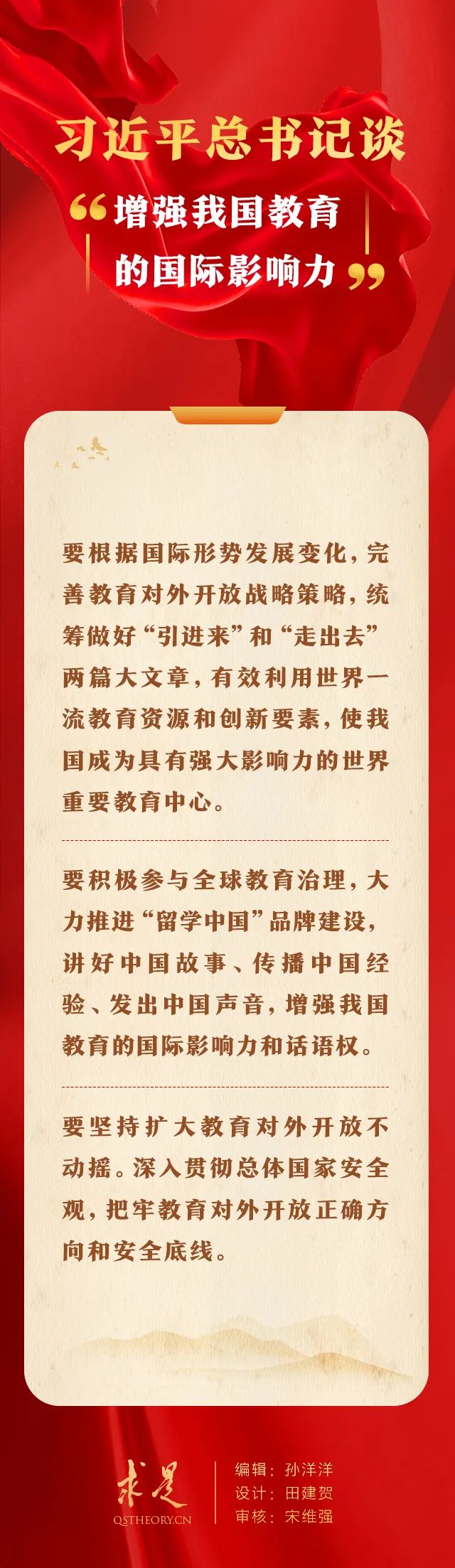 9月16日出版的第18期《求是》杂志刊发习近平总书记重要文章《扎实推动教育强国建设》。在这篇重要文章中,总书记从“培养担当民族复兴大任的时代新人”“加快建设高质量教育体系”“全面提升教育服务高质量发展的能力”“在深化改革创新中激发教育发展活力”“增强我国教育的国际影响力”“培养高素质教师队伍”6个方面,对扎实推动教育强国建设提出明确要求。