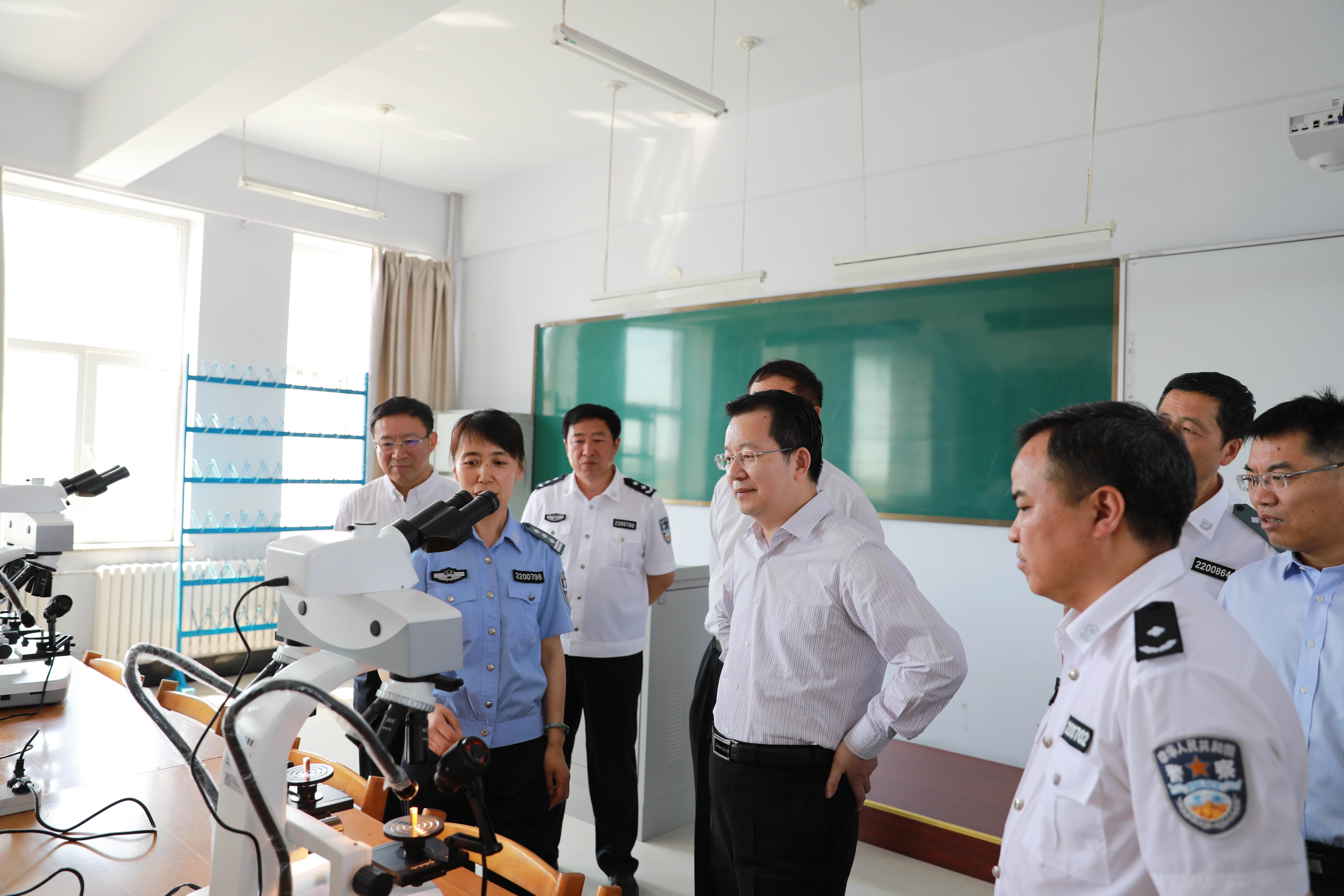 张毅厅长实地考察了学院教学楼、实训楼、餐饮中心、体育场和学生宿舍等设施,参观了射击馆、安全防范技术实训室、强制戒毒实验室、刑事侦查技术实验室和心理咨询室,观摩了学生的警务实战技能和警械使用技能课程、模拟法庭和心理测量课程。