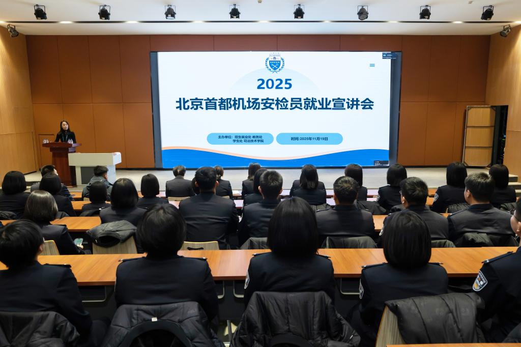 11月19日,司法技术学院协同学校教务处、招生就业处,特邀北京首航环宇航空地面服务有限公司入校举办机场安检员专题宣讲会。